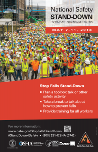 This year, the focus of the Stand-Down is on “Fall Hazards” and reinforcing the importance of “Fall Prevention.” Your organization may participate simply by taking a break to have a toolbox talk or another safety activity such as conducting safety equipment inspections, developing rescue plans, or discussing job specific hazards.